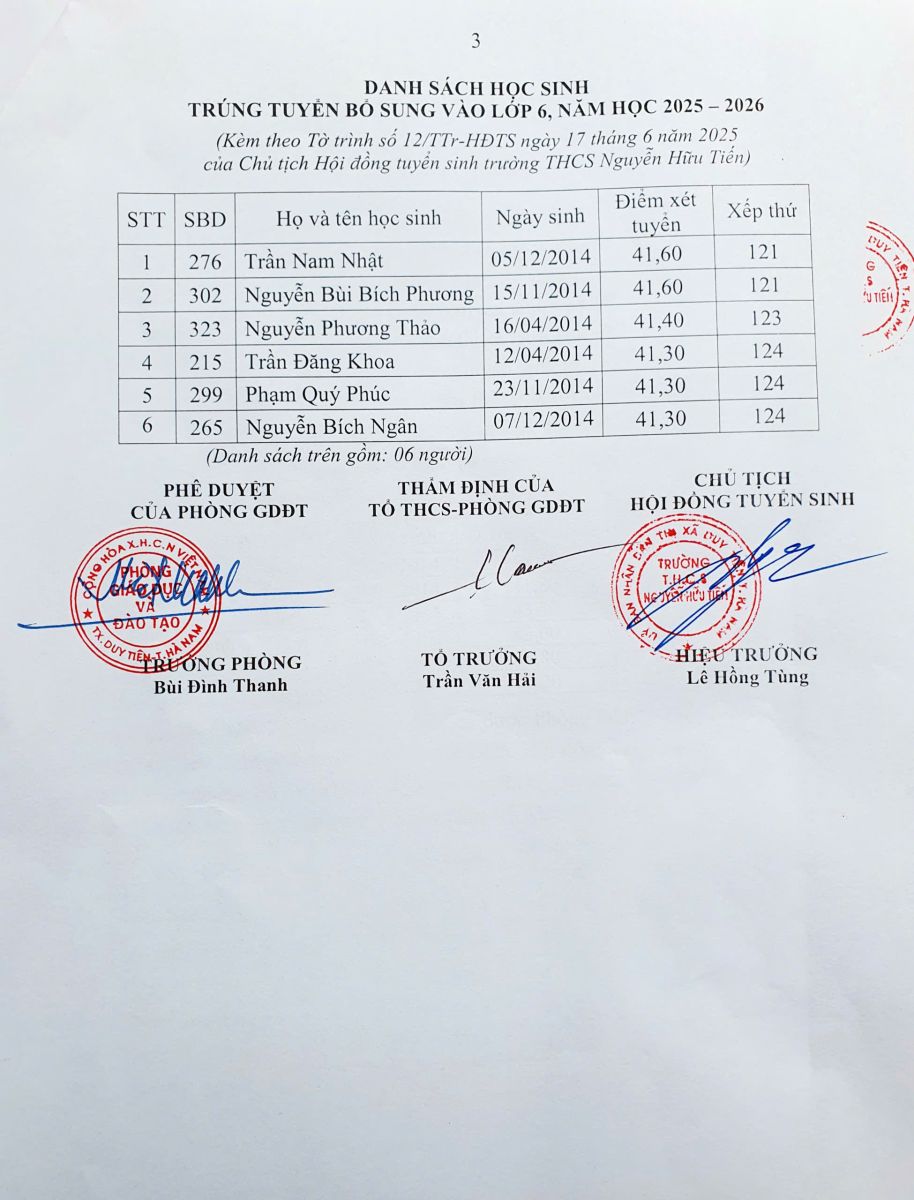 Thông báo kết quả xét tuyển bổ sung tuyển sinh vào lớp 6 năm